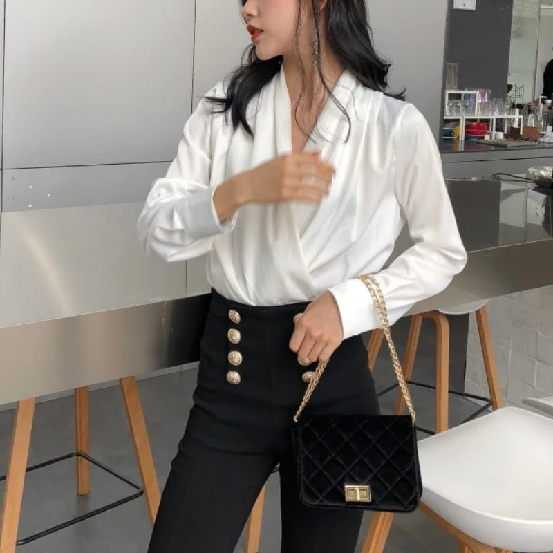 Découvrez LA blouse en satin manquante pour un dressing au top. Le haut blanc satiné est un intemporel. Que ce soit pour une journée travail ou une soirée entre copines, cette coupe cache coeur à manches longues sera parfaite. Sa fluidité donnera un style loose élégant super stylé. Porté rentré dans un pantalon taille haute, soyez sûre de ne faire aucun fashion faux pas.