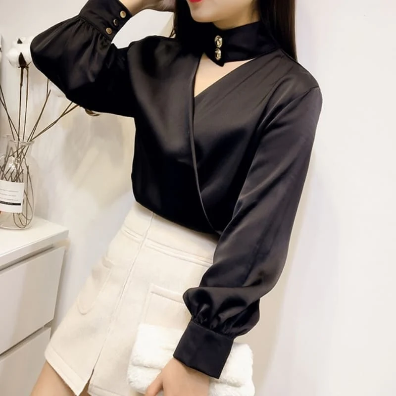 BLOUSE EN SATIN RAS DE COU DE COULEUR NOIR