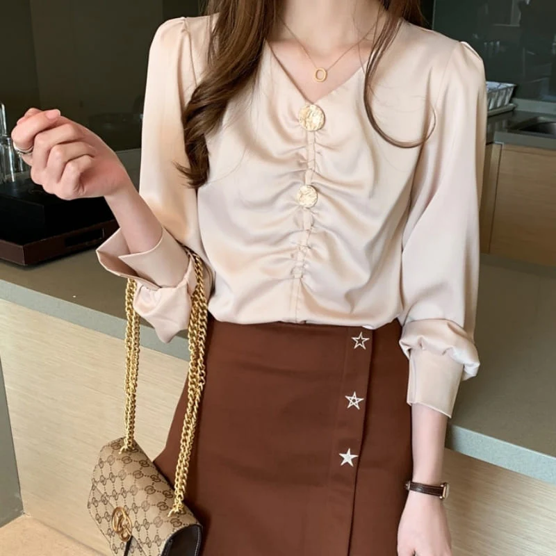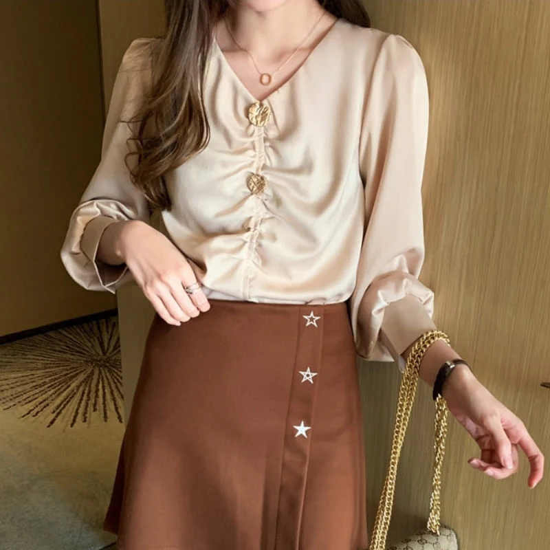 BLOUSE EN SATIN FRONCÉE À L’AVANT DE COULEUR BEIGE