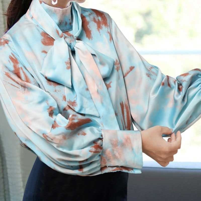 BLOUSE EN SATIN BLEU À IMPRIMÉ TIE AND DYE