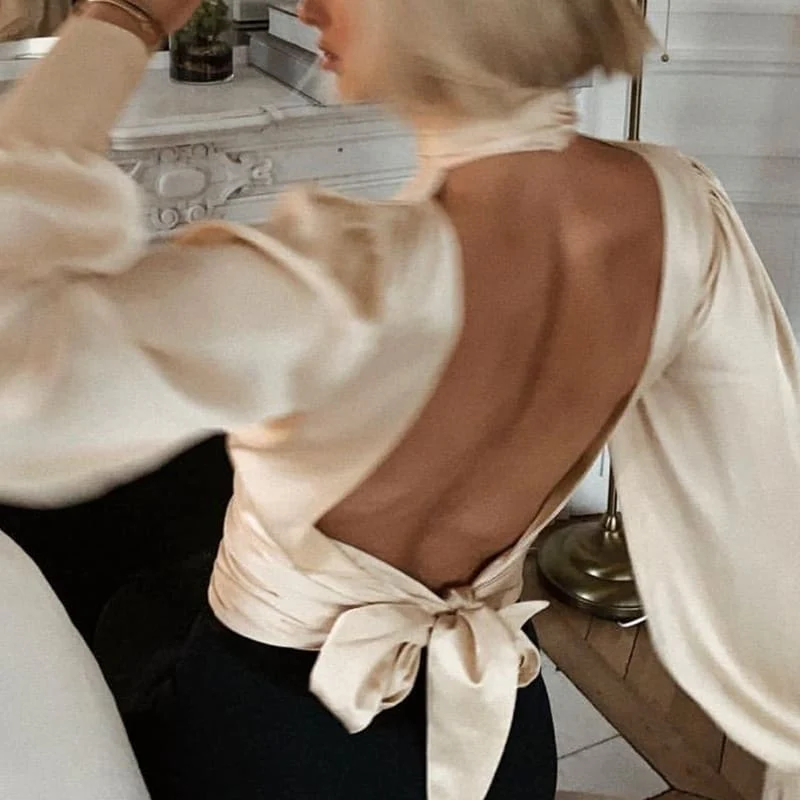 Prête à attirer tous les regards en portant cette éblouissante blouse en satin ? Sa couleur beige satinée se porte facilement avec tout. Soyez sûre d’être super sexy grâce à cette coupe cintrée à col montant, ouverte tout le long du décolleté. L’arrière du haut laisse place à un incroyable dos nu super sexy. Les manches longues bouffantes donneront du volume à votre look.