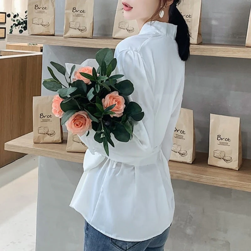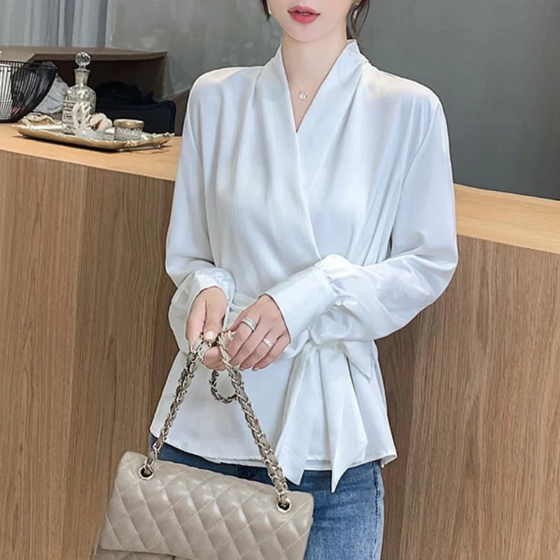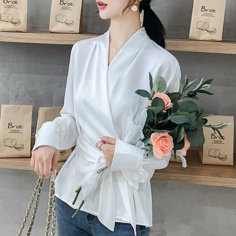 Vous recherchez une pièce pour adopter un style élégant ? Alors nous avons pour vous la parfaite blouse en satin ! Ce blanc satiné apportera pureté et vivacité à votre tenue. On adore cette coupe fluide à manches longues qui est très agréable à revêtir. L’effet cache coeur à l’avant ajoute une touche de style en plus. N’ayez pas peur de marquer votre silhouette grâce à la taille ceinturée par un joli noeud.
