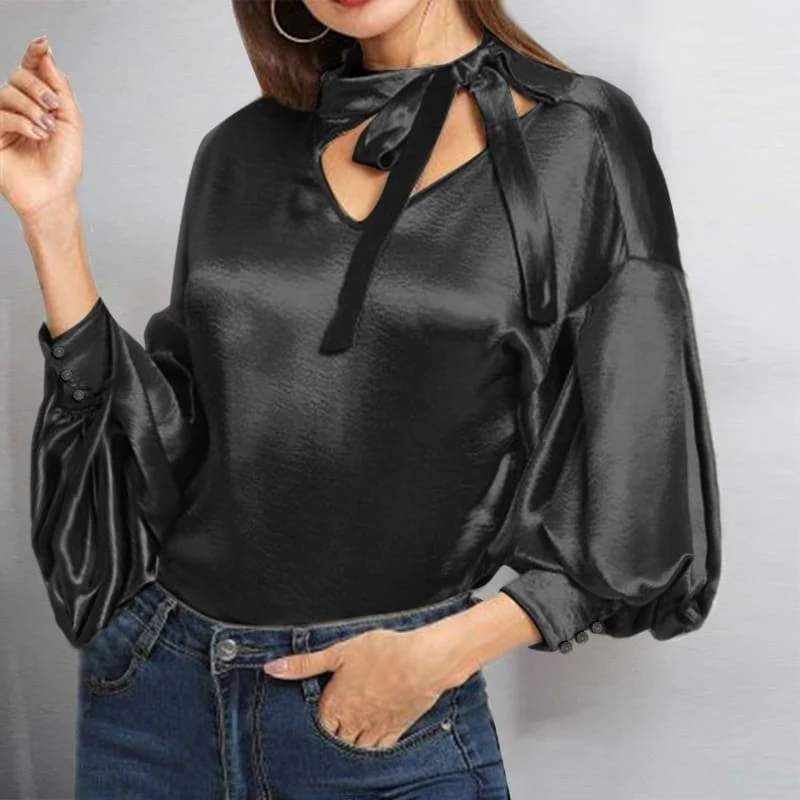 BLOUSE EN SATIN DE COULEUR NOIR POUR FEMME COL À NOEUD
