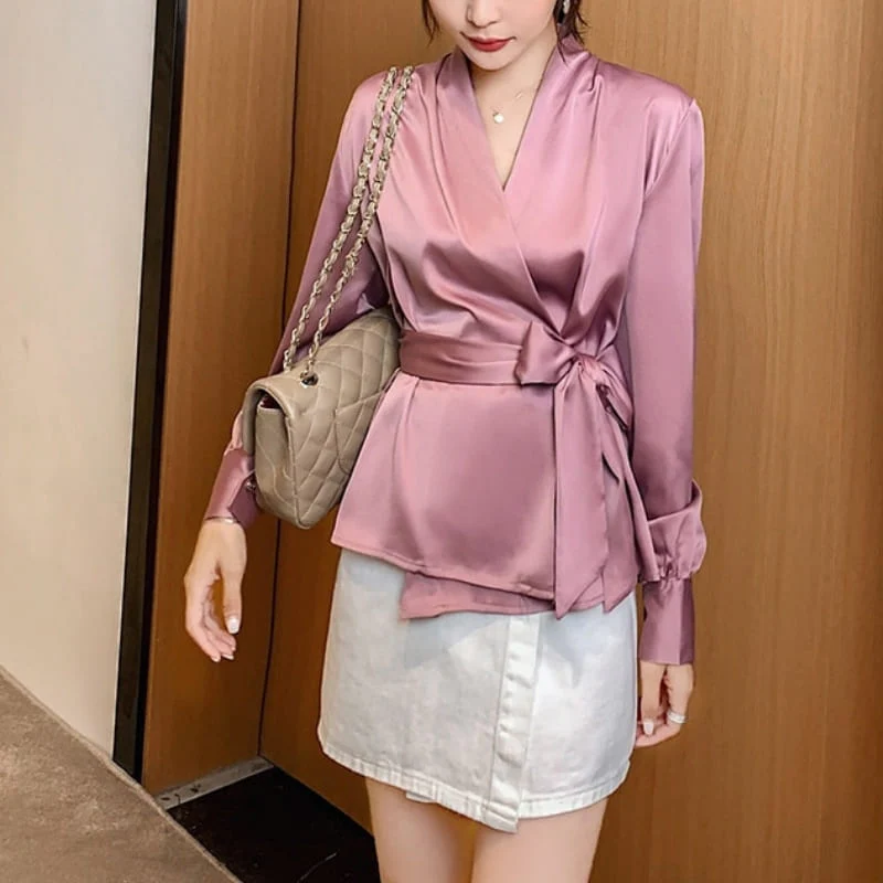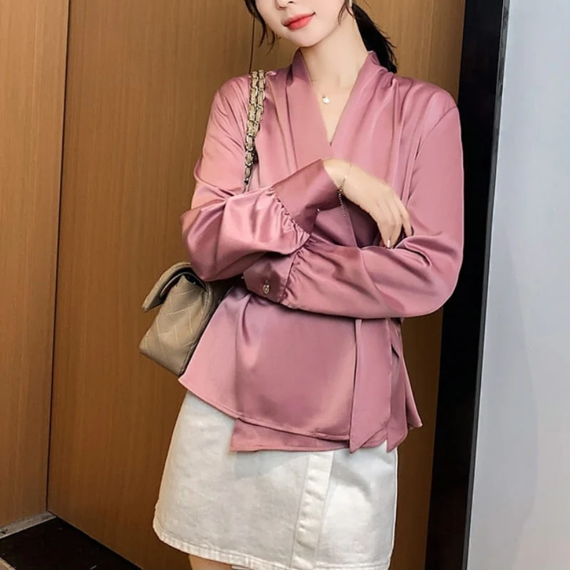 BLOUSE EN SATIN DE COULEUR ROSE À NOEUD