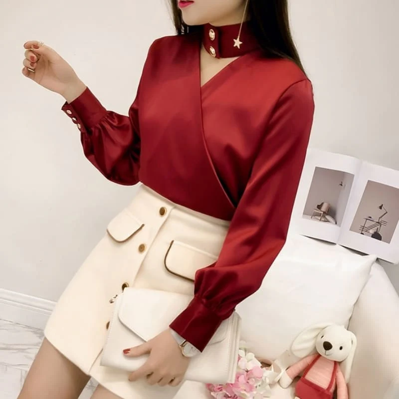 BLOUSE EN SATIN DE COULEUR ROUGE AVEC COL RAS DE COU