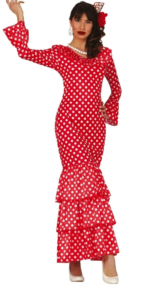 Déguisement de Flamenca Pois pour femme pour le carnaval et la Feria de Abril. Choisissez votre costume de sevillana et dansez sans relâche lors de vos soirées flamenco. Découvrez notre catalogue d’accessoires pour compléter votre costume et devenir une véritable danseuse de flamenco.