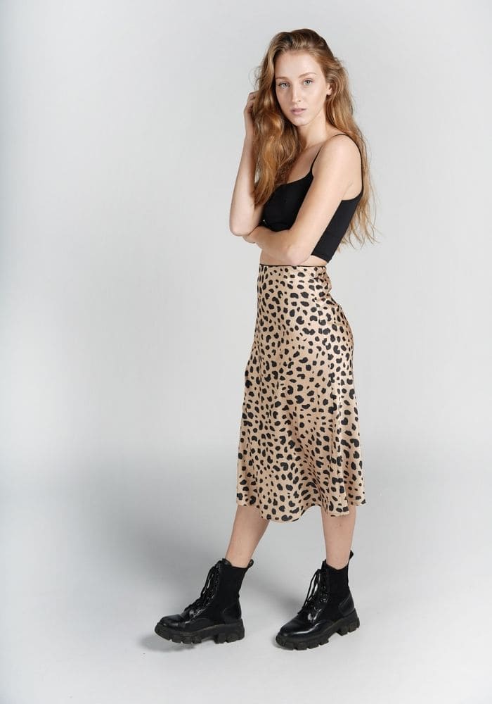 Vous ne pouvez pas passer à côté de la mode de la jupe en satin ! C’est la pièce à avoir pour adopter un look élégant en toutes circonstances. On craque pour son imprimé léopard noir sur fond beige, qui vient donner une touche sauvage sexy. Sa coupe finissant aux dessous des genoux est idéale à porter en toutes saisons.