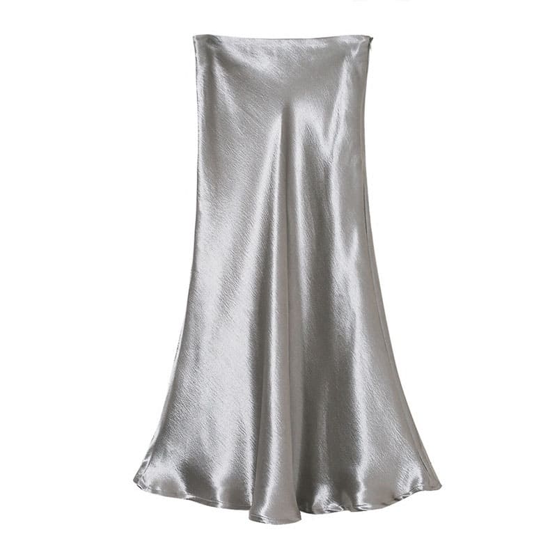 JUPE EN SATIN MI-LONGUE ARGENTÉE