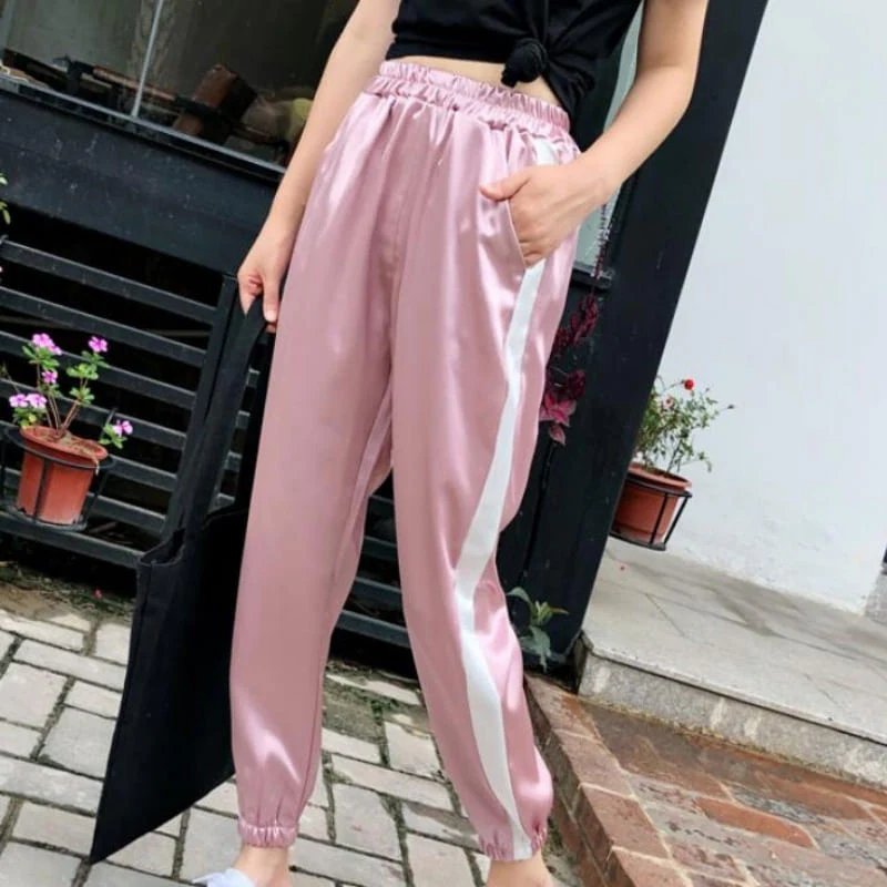 PANTALON EN SATIN DE COULEUR ROSE AVEC BANDE