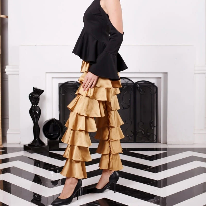 N’ayez plus peur du regard des autres et osez l’originalité avec ce fabuleux pantalon en satin. Soyez sûre d’avoir une tenue 100% authentique grâce à ces mignons volants. Sa jolie couleur jaune donne cet effet doré tellement luxueux. L’association des froufrous à cette matière légère et soyeuse, vous donnera une parfaite sensation aérienne.