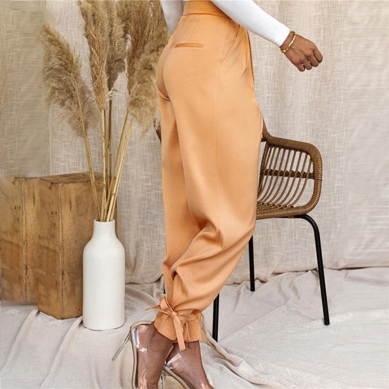 Apportez de la couleur dans votre quotidien en portant ce fabuleux pantalon en satin. Cette éclatante couleur orange satinée apportera de l’énergie à votre look et reflétera votre joie de vivre. Vous vous sentirez tellement à l’aise dans cette coupe ample style sarouel, joliment fermé aux chevilles avec des noeuds. On adore mettre en avant cette couleur, en le portant avec un haut moulant blanc.