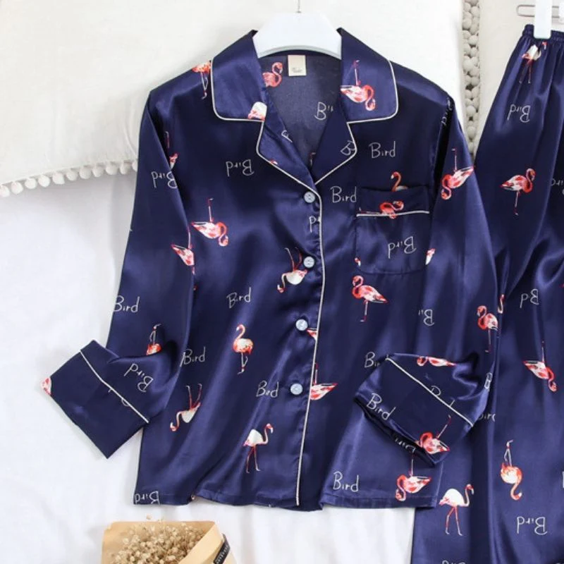 Soyez stylé en toutes circonstances, même la nuit avec cet incroyable pyjama en satin. Vous craquerez à coup sur pour ce beau bleu marine satiné décoré de mignons petits flamants roses. De quoi faire de beaux rêves ! En hiver comme en été, cette coupe chemise et pantalon, à la matière douce et légère sera incroyablement agréable.