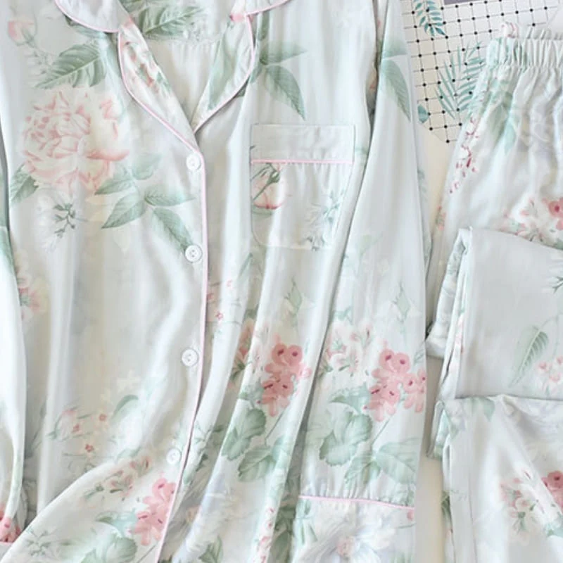 La douceur de ce resplendissant pyjama en satin vous fera vivre de merveilleuses nuits ! Cette délicate couleur vert pastel décoré de belles fleurs japonaises vous apportera de la tendresse et de la finesse. La fluidité du haut chemise et du pantalon long est le plus agréable à porter pour une douce nuit.