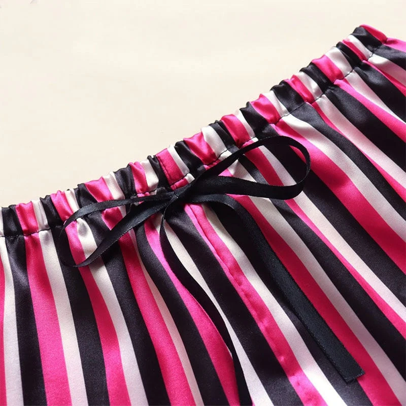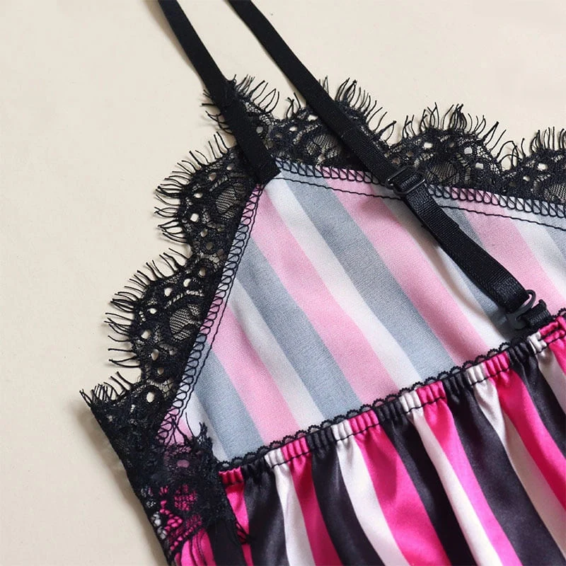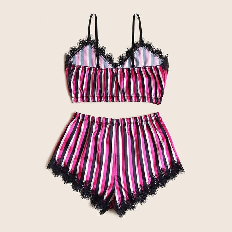 Qui a dit qu’on ne pouvait pas être tendance même pour dormir ? Avec notre sublime pyjama en satin, conciliez mode et confort ! Grâce à ce bel imprimé à rayures rose, blanc et noir, rêvez tout en étant stylé n’aura jamais été aussi facile. Avec son beau décolleté en v en dentelle noire ainsi qu’en bas du short, vous serez en plus de cela super sexy !