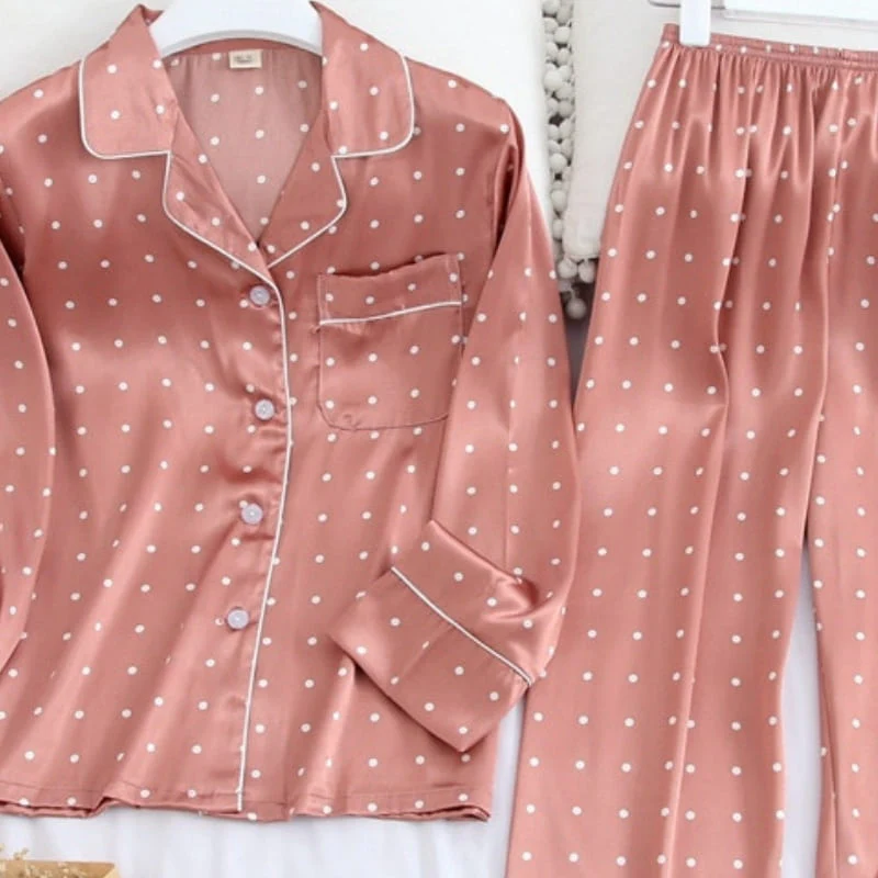 Faites de beaux rêves en enfilant ce magnifique pyjama en satin pour passer une bonne nuit. Cette jolie couleur rose poudrée satinée agrémentée de petits pois blancs, vous fera vivre votre nuit tout en douceur. On craque pour l’association de cette coupe fluide et cette matière légère, tellement agréable à porter. Haut chemise à manches longues et col à revers.