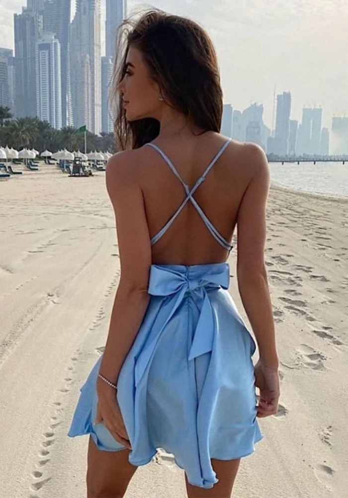 En chaque occasion, cette magnifique robe en satin deviendra votre meilleure alliée. Sa jolie couleur bleu ciel apportera de la douceur et gaieté à votre tenue. Plus qu’une simple robe, avec son beau dos nu croisé, elle deviendra votre arme de séduction. Ceinturé par un noeud attaché à l’arrière, vous pourrez marquer votre taille.