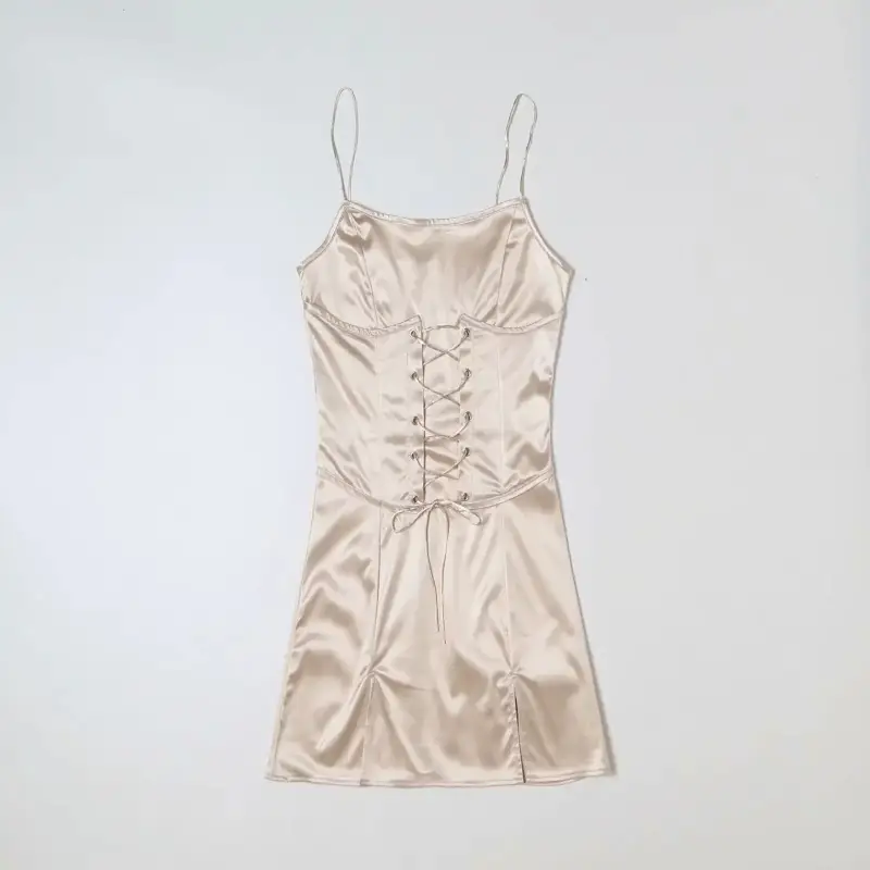 Robe Satin Courte Beige avec Lacets – Glamour & Sensualité